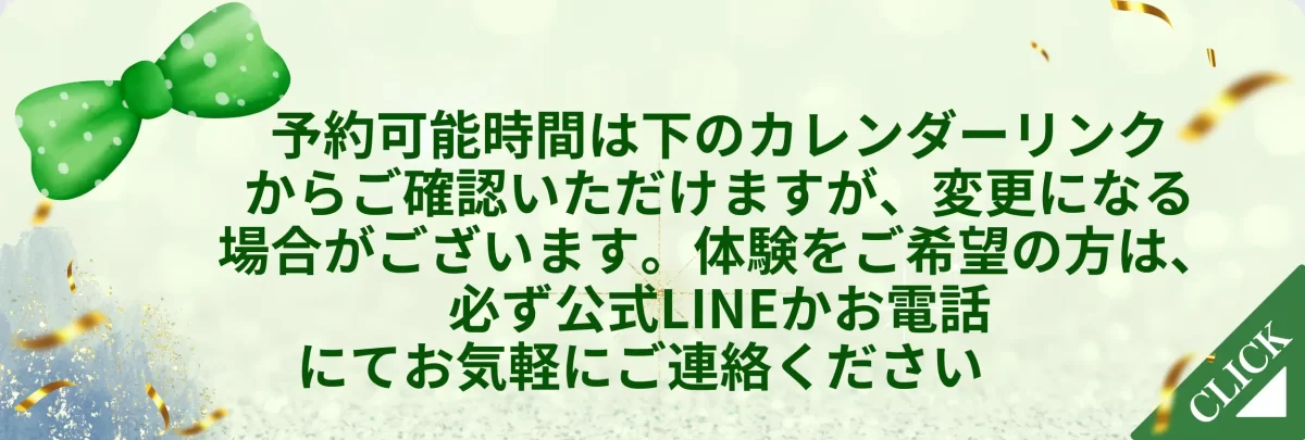 予約可能な時間は、カレンダーにてご確認いただけますが、少人数制のため更新が間に合わない事がございます。ご希望日時がございましたら、LINEまたはお電話にてお申し込みください。